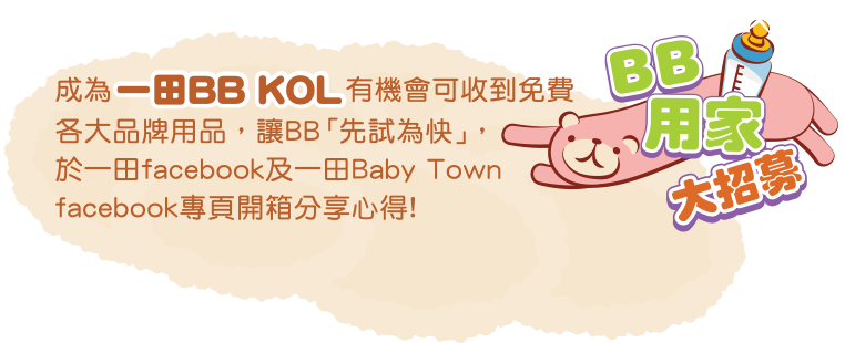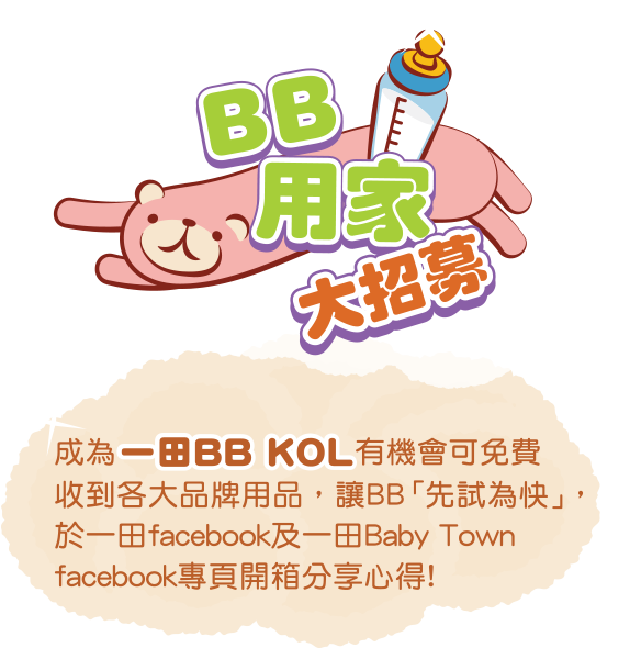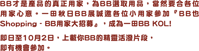 - 名額有限,成功上載片段後,一田將進行挑選。最有活力,精靈活潑及最具人氣BB可增加參賽機會。成功參加BB 用家大招募決賽將會有專人聯絡。