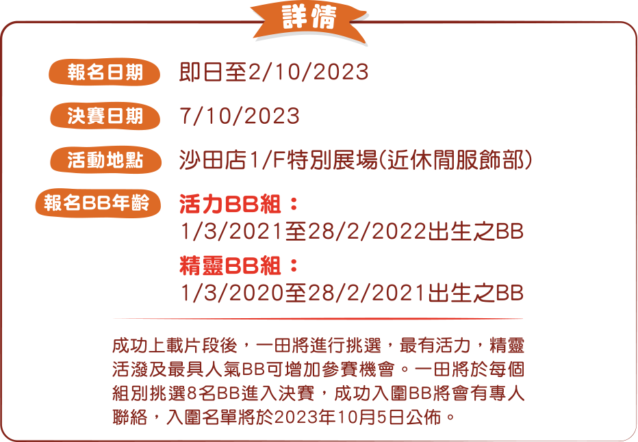 - 參賽BB須為2021年3月1日至2022年2月28日出生之BB。成功參賽後,需於比賽當日登記時出示出生證明副本。